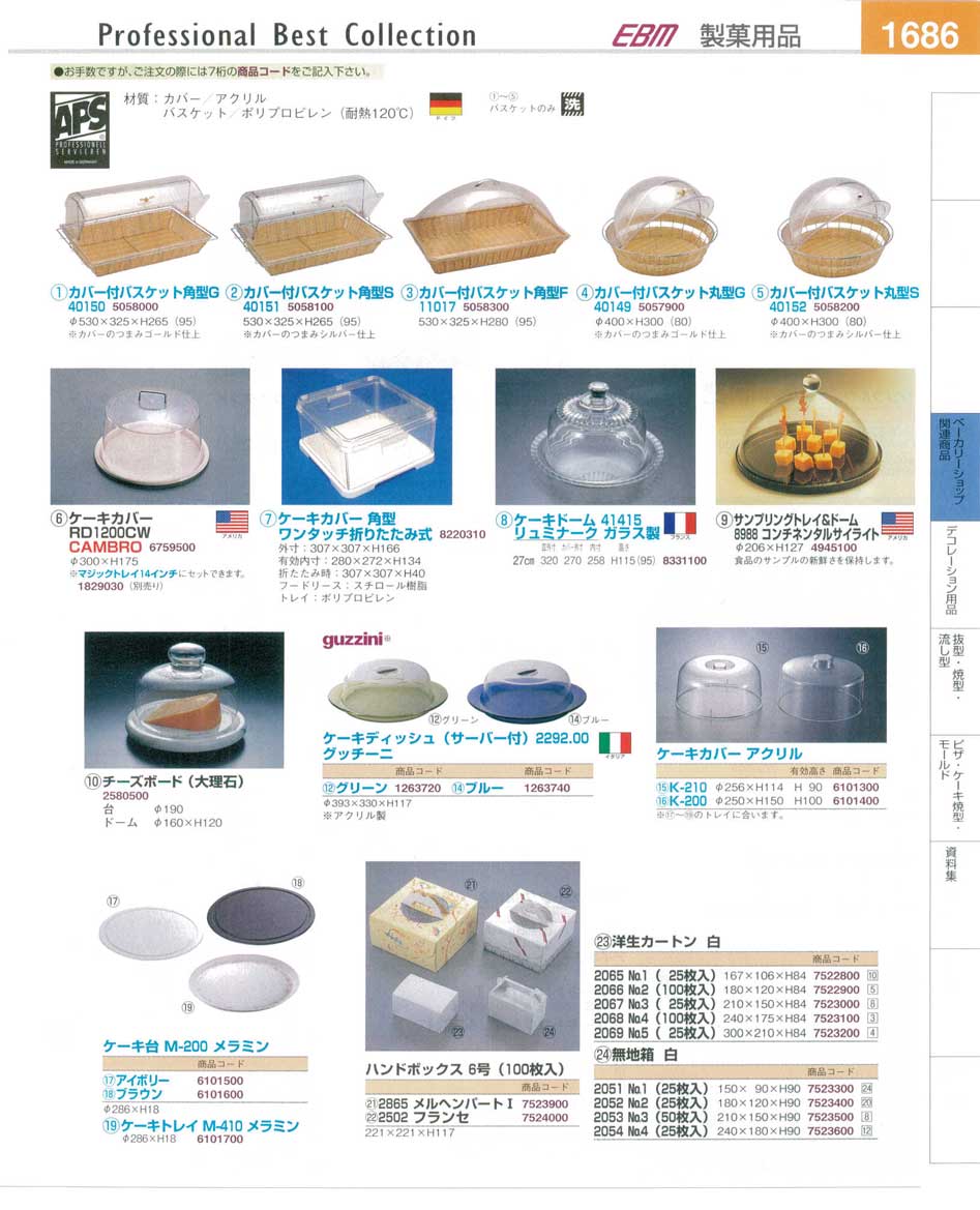 カバー付バスケット・ケーキカバー・バスケット・ハンドボックス・洋生カートン プロフェッショナルベストコレクション14−2 EBM−1686ページ:パンフレットを見るには、スクリプト対応ブラウザが必要です。