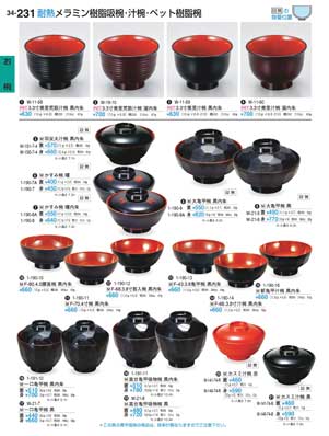 231ページ 耐熱メラミン樹脂吸椀・汁椀・ペット樹脂椀Heat-resistant Soup Bowls |