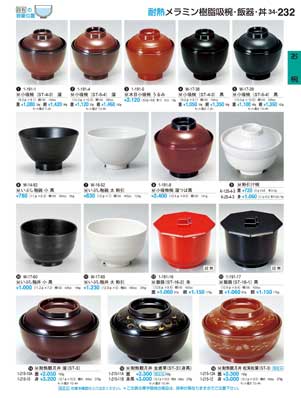 232ページ 耐熱メラミン樹脂吸椀・飯器・丼Heat-resistant Soup Bowls/Bowls |