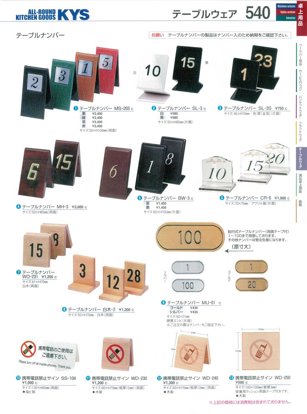テーブルナンバー MU−01 ゴールド シンビ (※1〜100より指定)