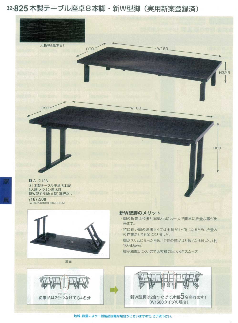 木製テーブル座卓 8本脚 6人膳 メラミン黒木目 新W型脚ずり脚 幕板なし(商品番号32-825-1)
