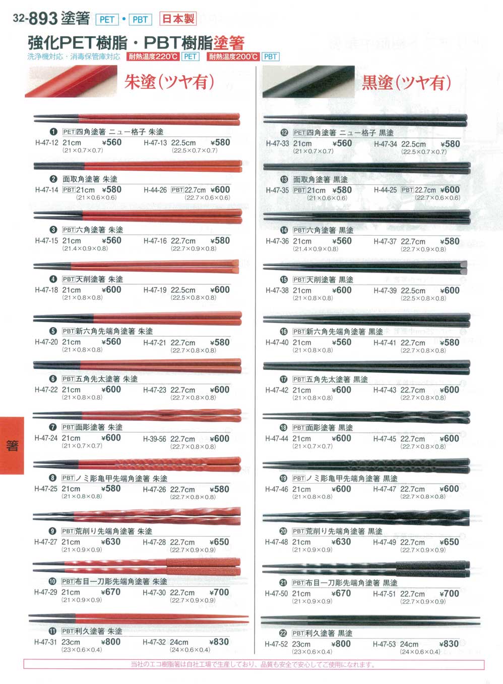 PBT22.7×0.9×0.8 洗 洗浄機対応・消毒保管庫対応 耐熱温度200℃/PBT 当社のエコ樹脂箸は自社工場で生産しており、品質も安全で安心してご使用になれます。