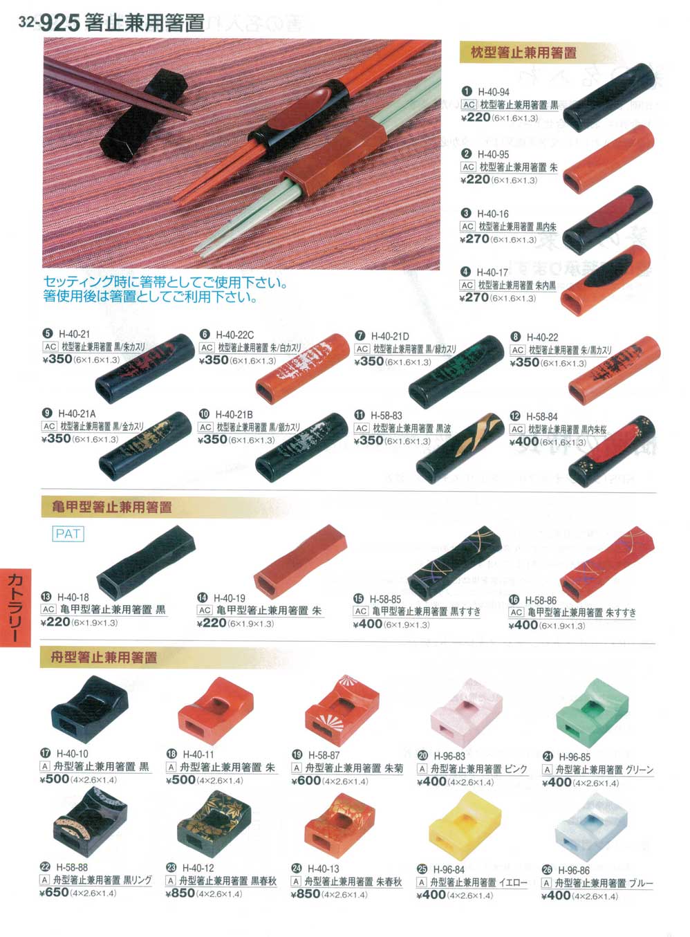 枕型箸止兼用箸置 黒内朱