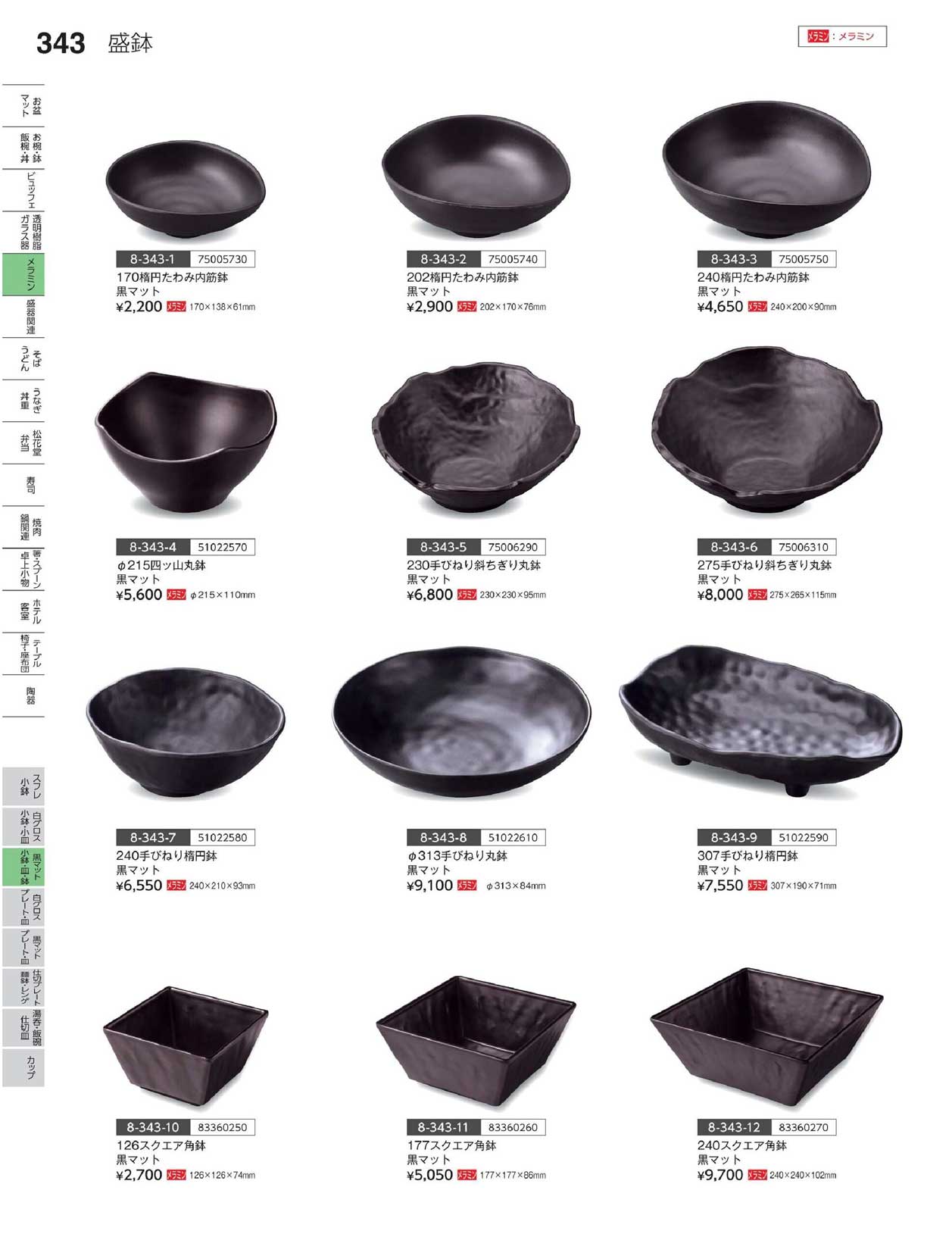 メラミン)240手びねり楕円鉢 黒マット(商品番号8-343-7)