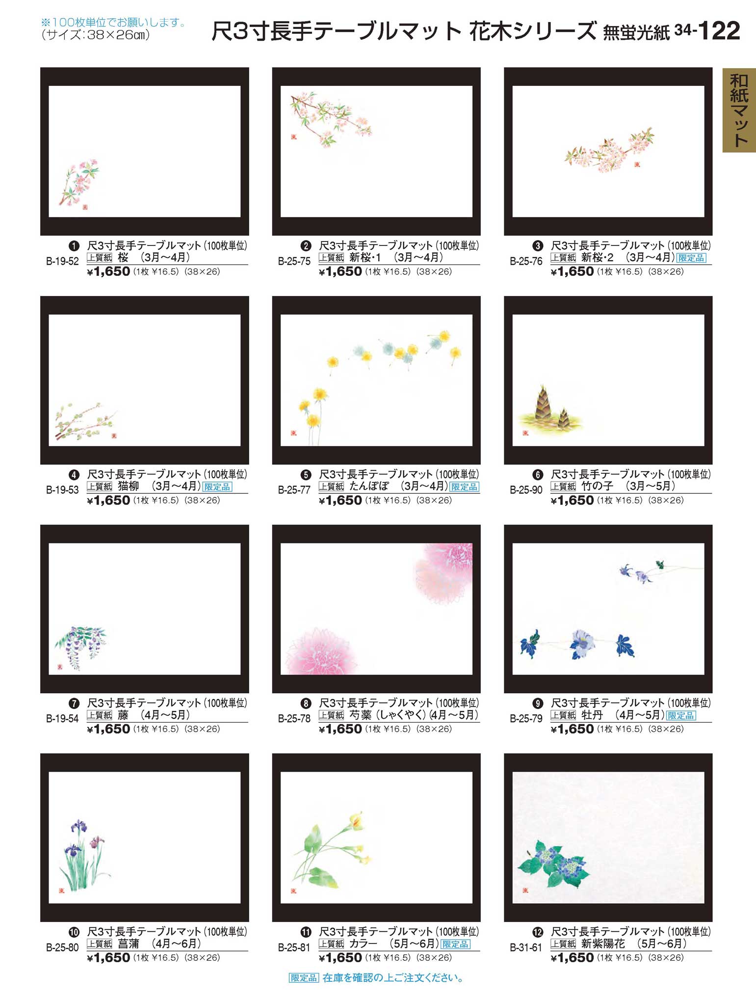 上質紙尺3寸長手テーブルマット(100枚) 牡丹(4月から5月)限定品