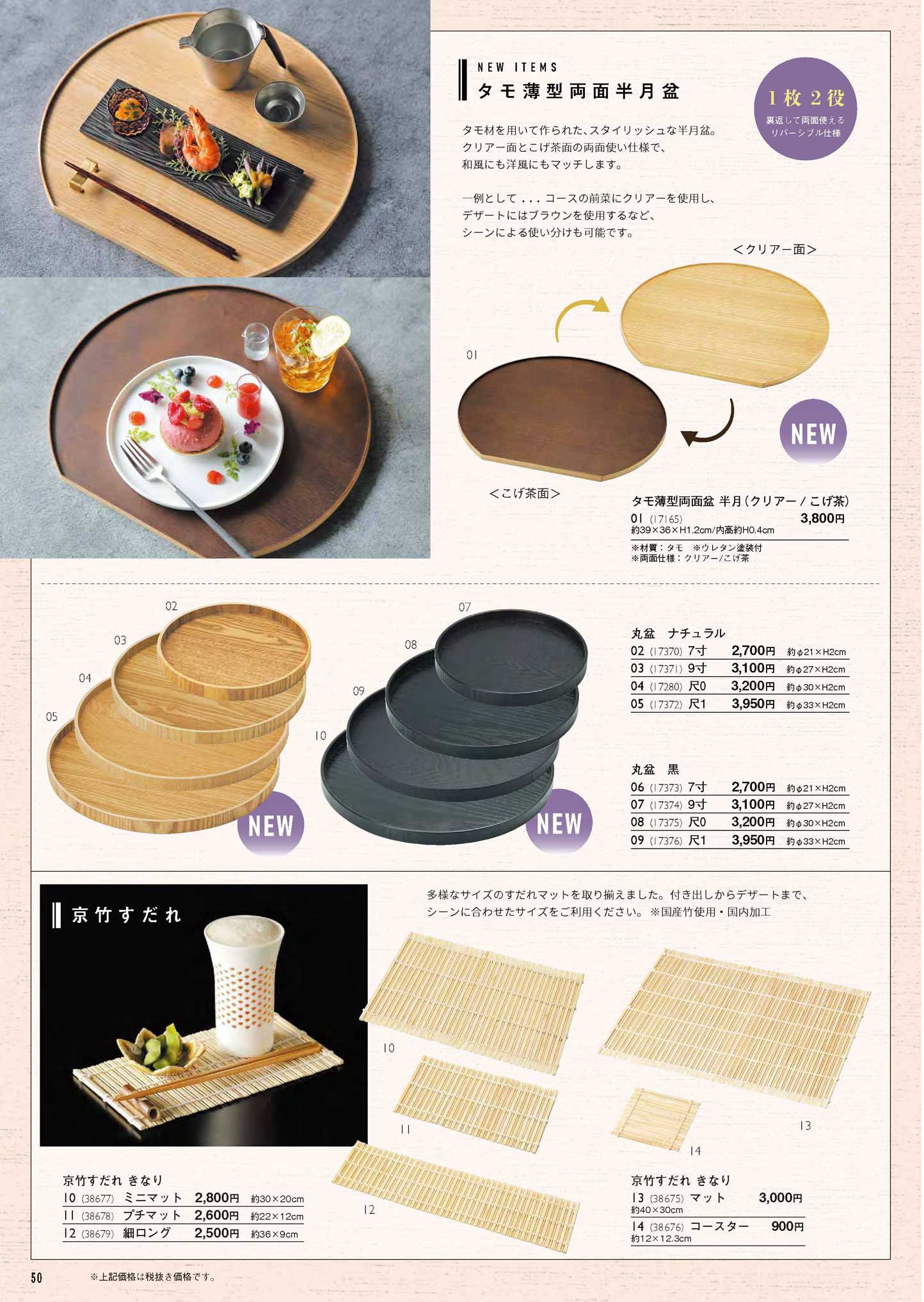 タモ薄型両面盆 半月(クリアー/こげ茶)