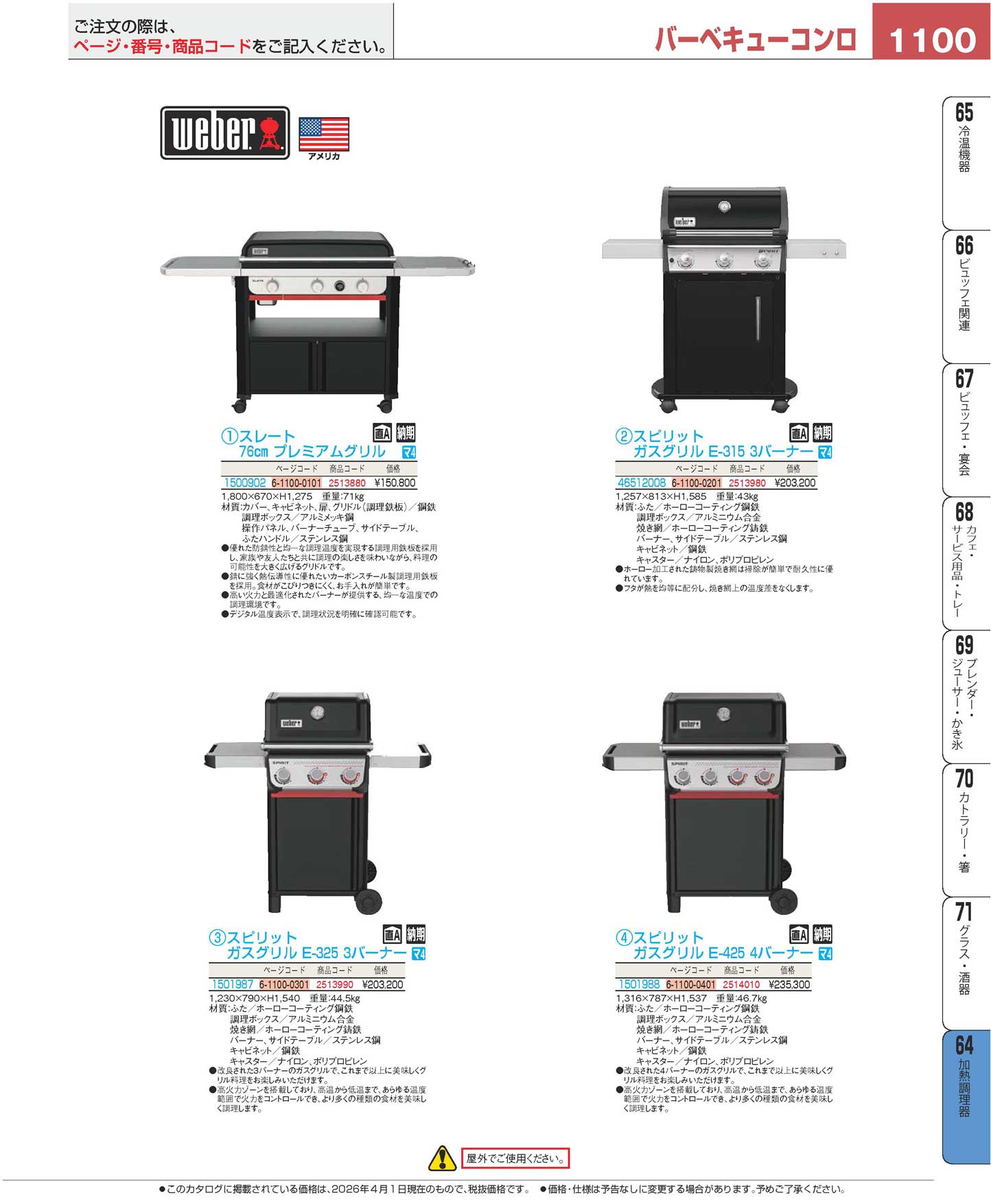 ウェーバー スピリット ガスグリル E-425 4バーナー 1501988(160)