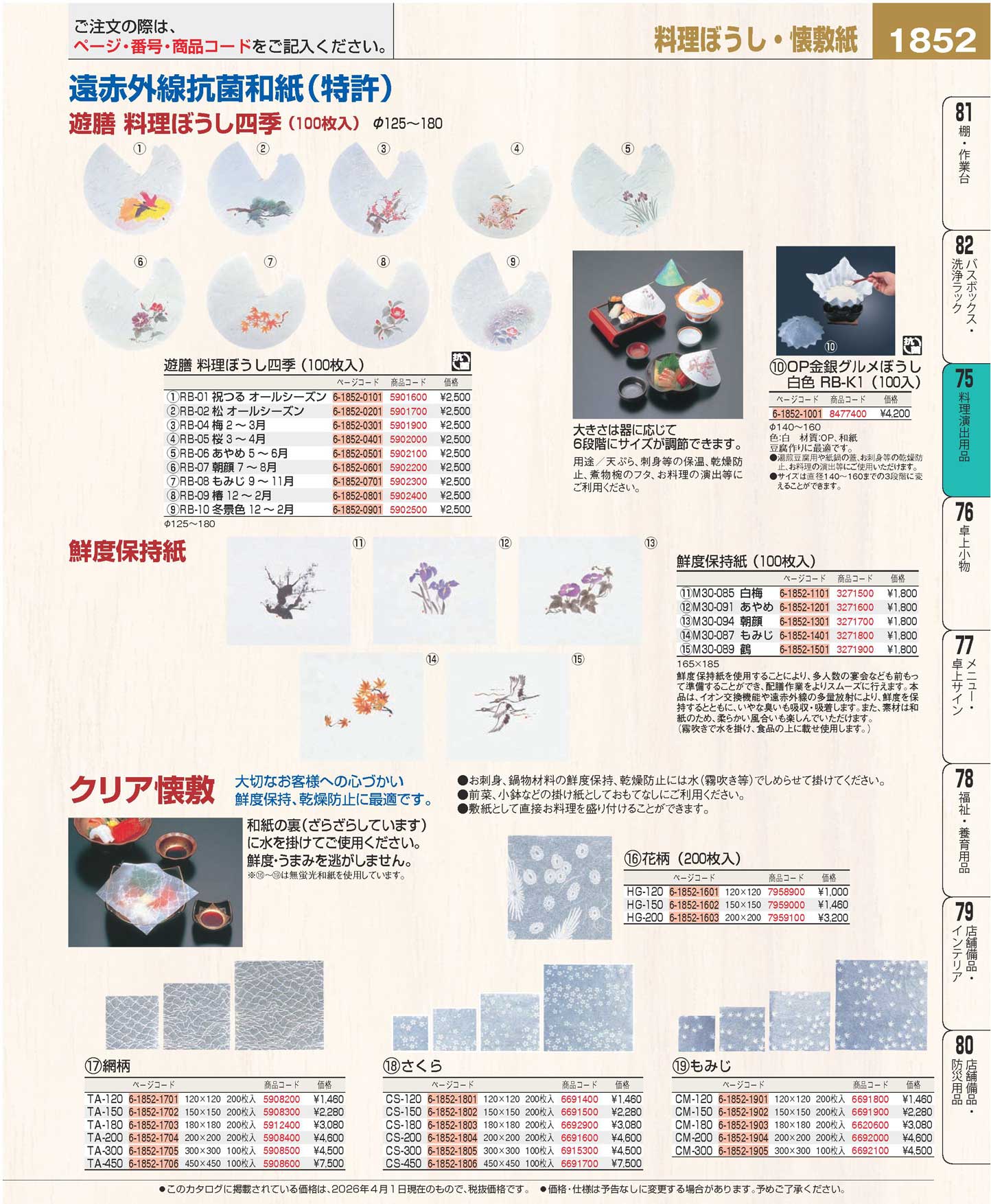 遊膳 料理ぼうし四季(100枚入)RB-04 梅(2月から3月)(90)