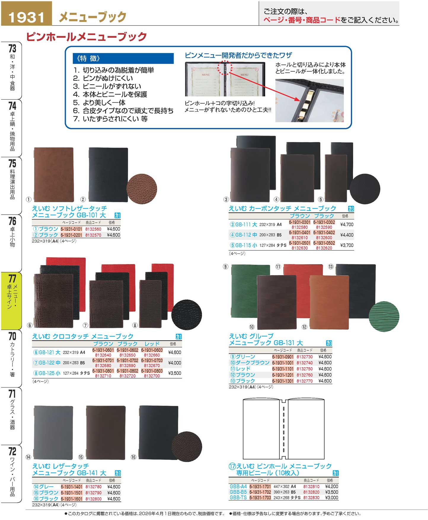 えいむ ピンホールグルーブメニューブック GB-131 大 レッド(110)