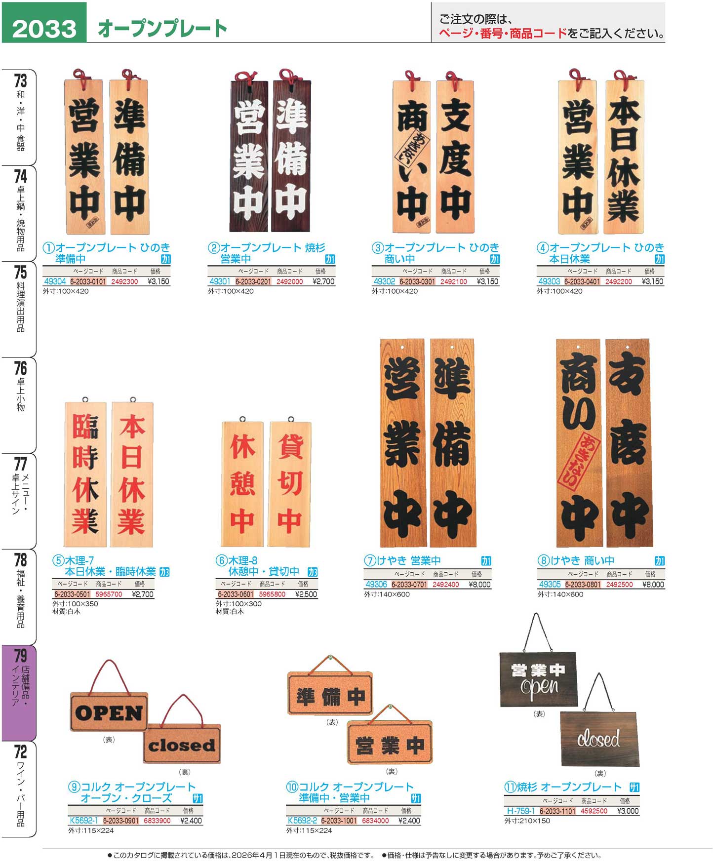 オープンプレート ひのき 本日休業(49303)(110)