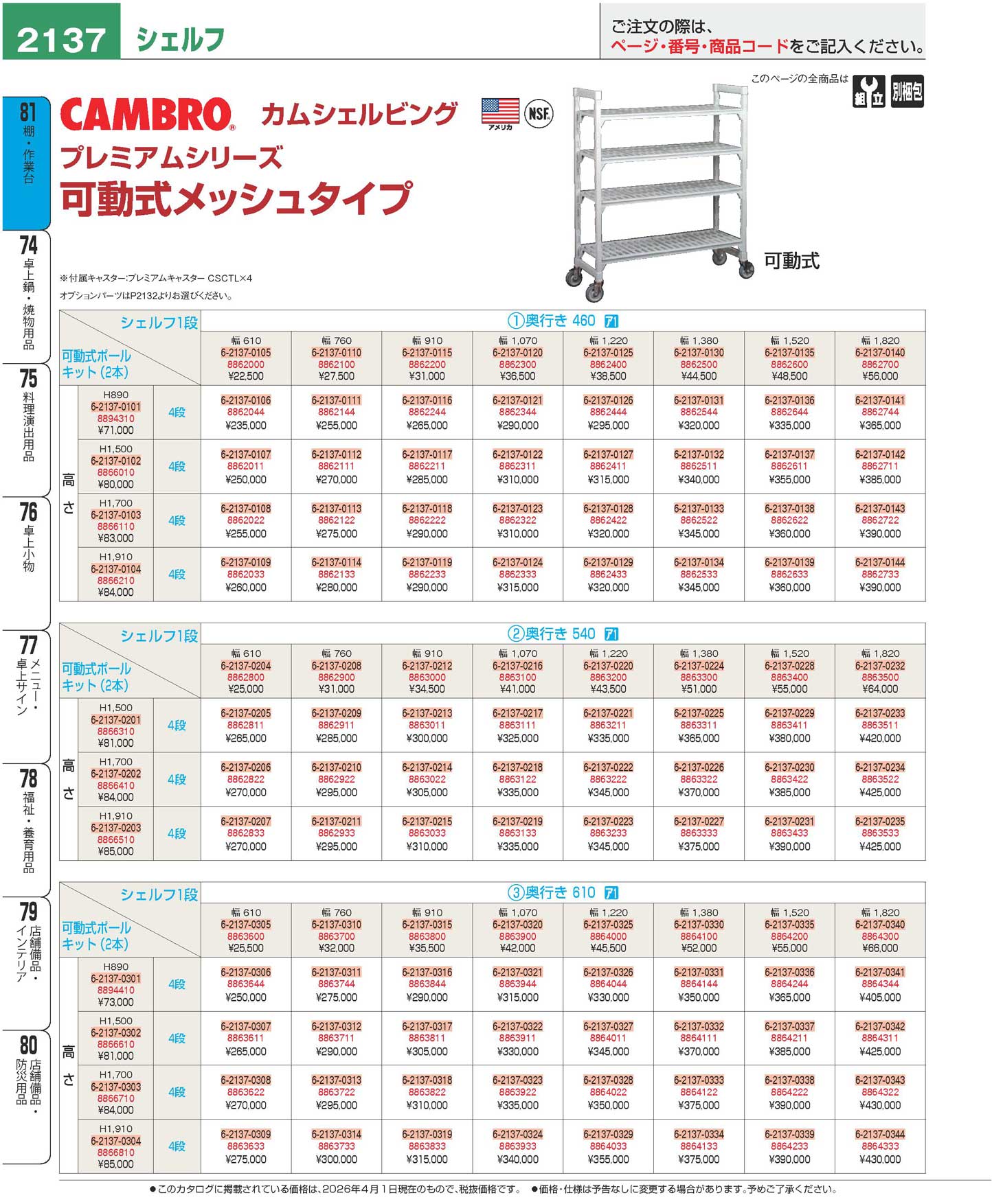 カムシェルフ可動 610×1380×H890 4段 メッシュ CPMU245435V4(480)(100)