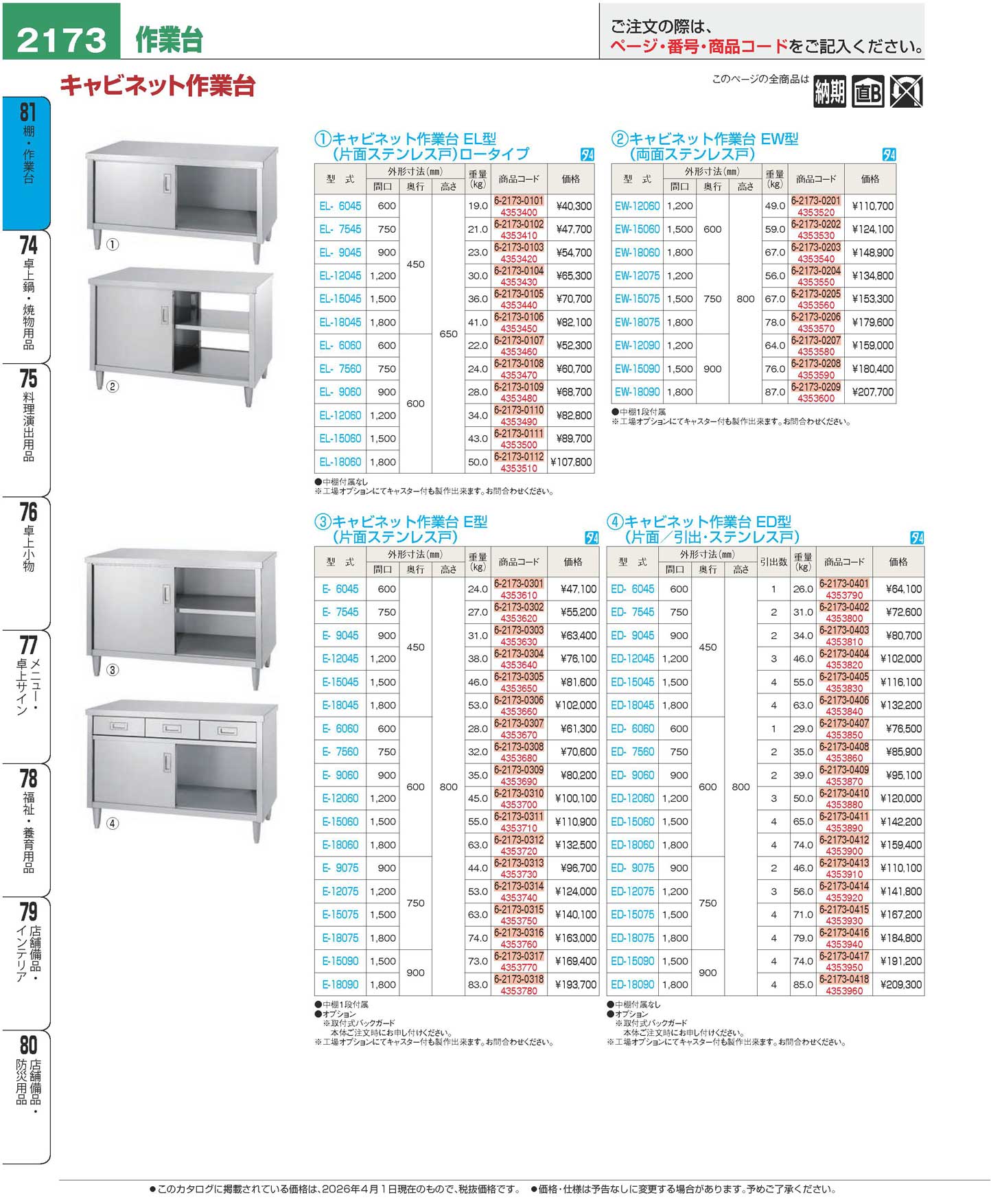 キャビネット作業台 E型(片面ステンレス戸)E-18060(130)