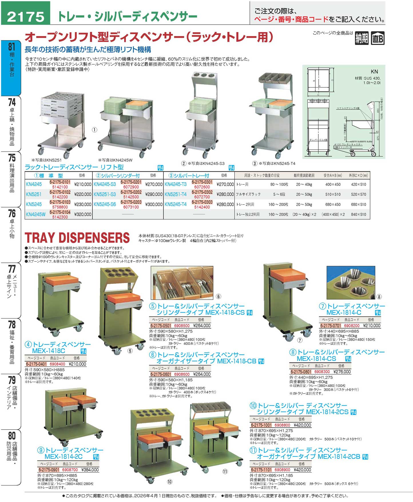 ラック・トレーディスペンサー リフト型 KN5245-T4 シルバートレー付(120)