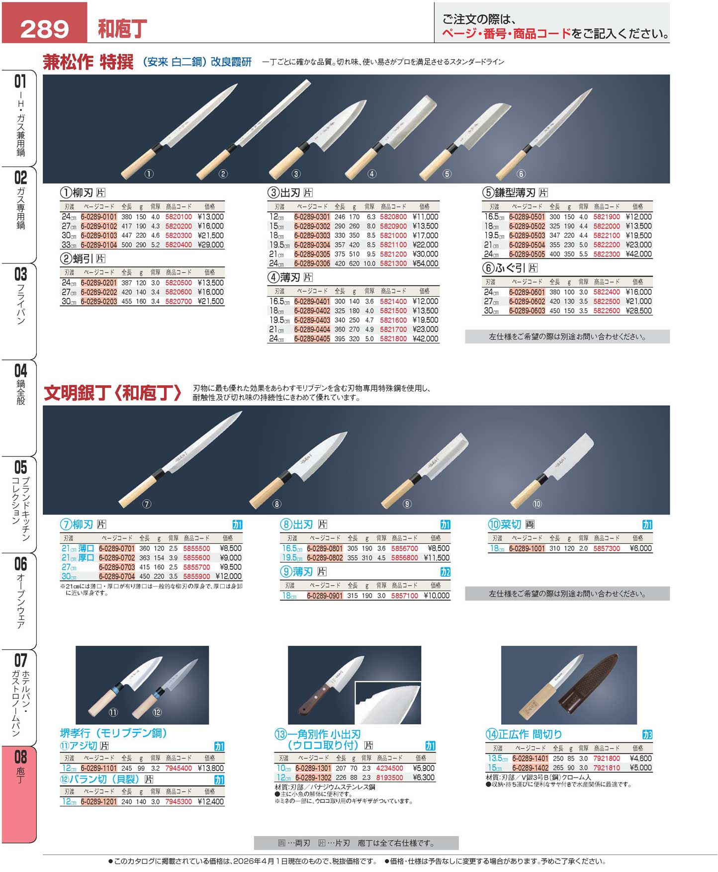 兼松作 特撰 鎌型薄刃庖丁 19.5cm(90)