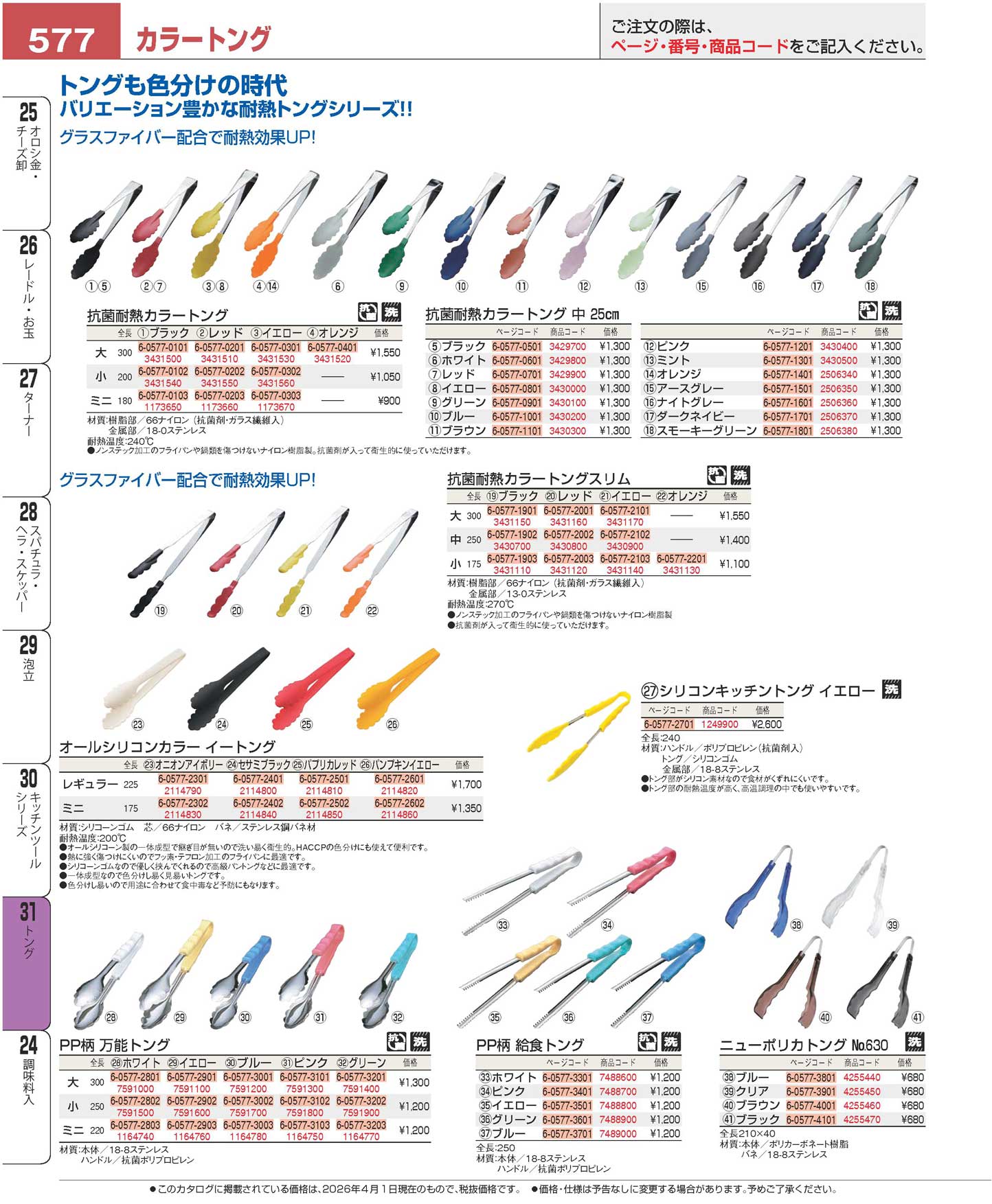 PP柄 給食トング カラーハンドル ホワイト 25cm 4W(90)