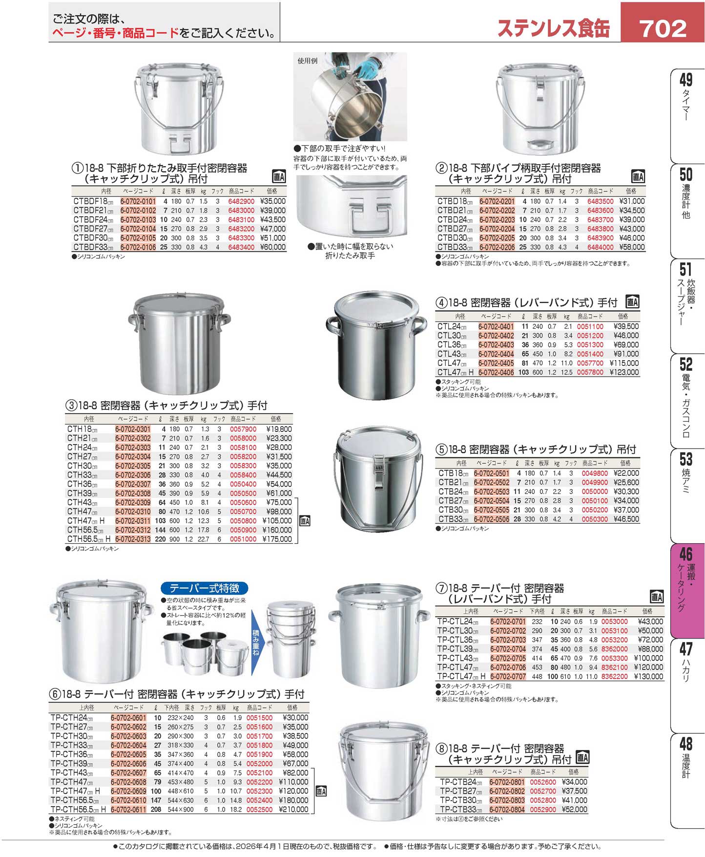 18-8 テーパー付 密閉容器(キャッチクリップ式)手付 TP-CTH 56.5cmH(90)